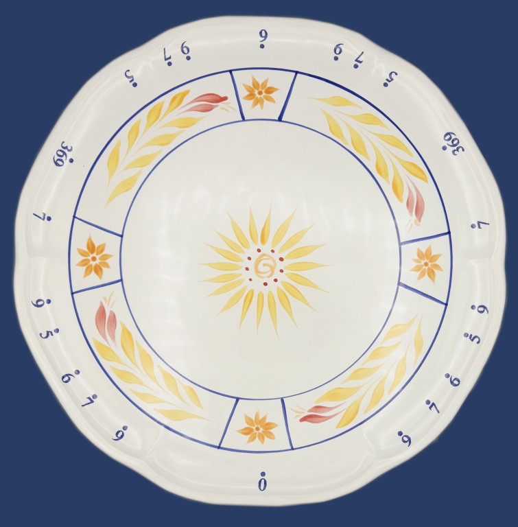 Ce plat permet une découpe en parts égales, quel que soit le nombre de convives ! Il est désormais aisé de faire 3, 5, 6, 7 ou 9 part égales : en partant du zéro du bas, il suffit de couper en diagonale, en passant par le centre, pour rejoindre le chiffre correspondant au nombre de parts.